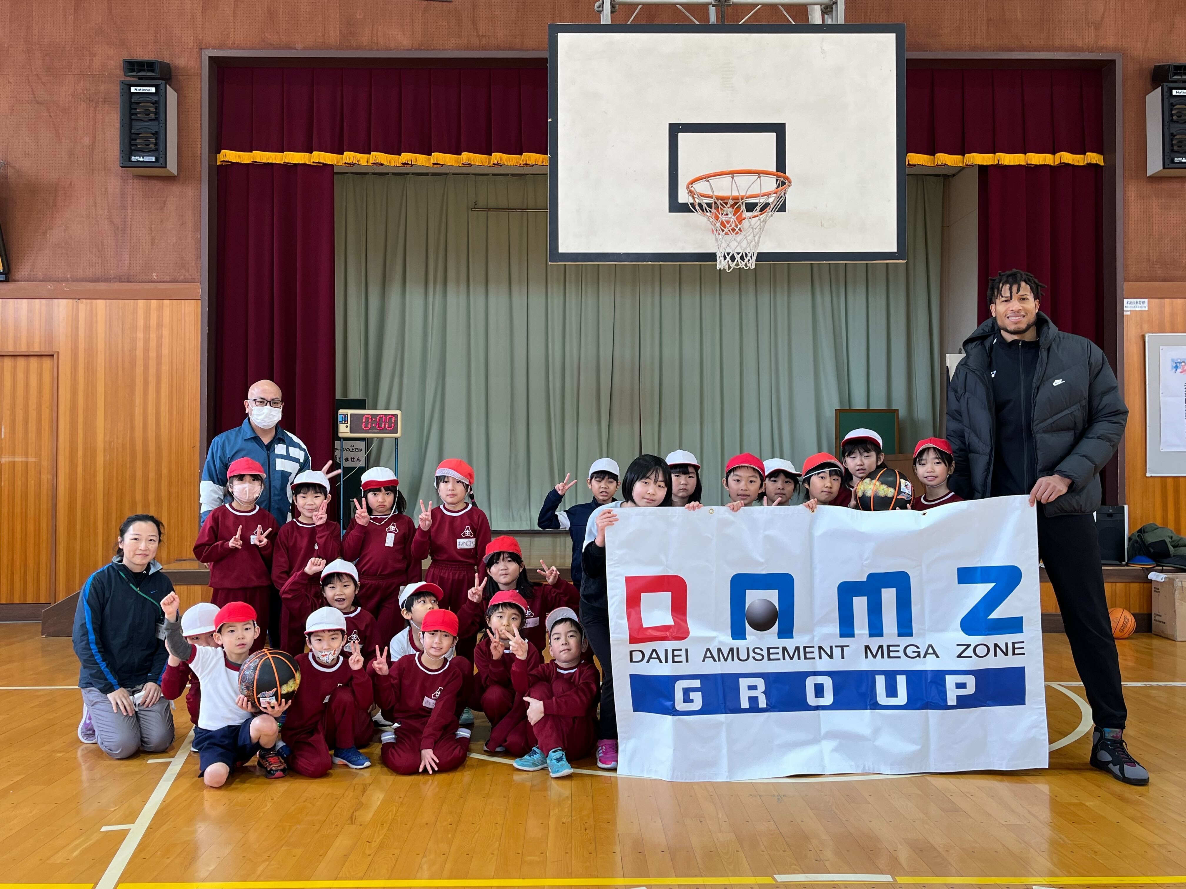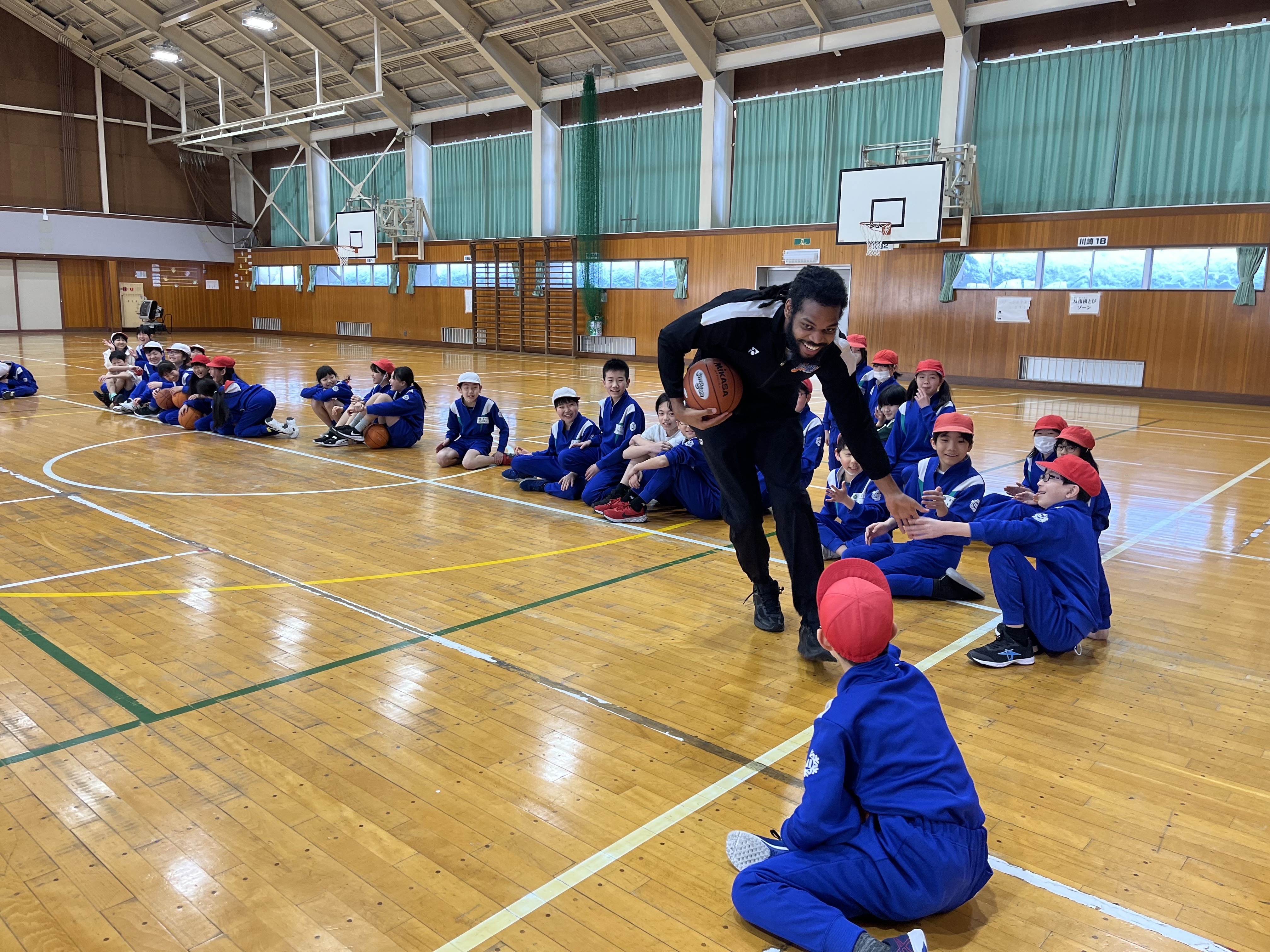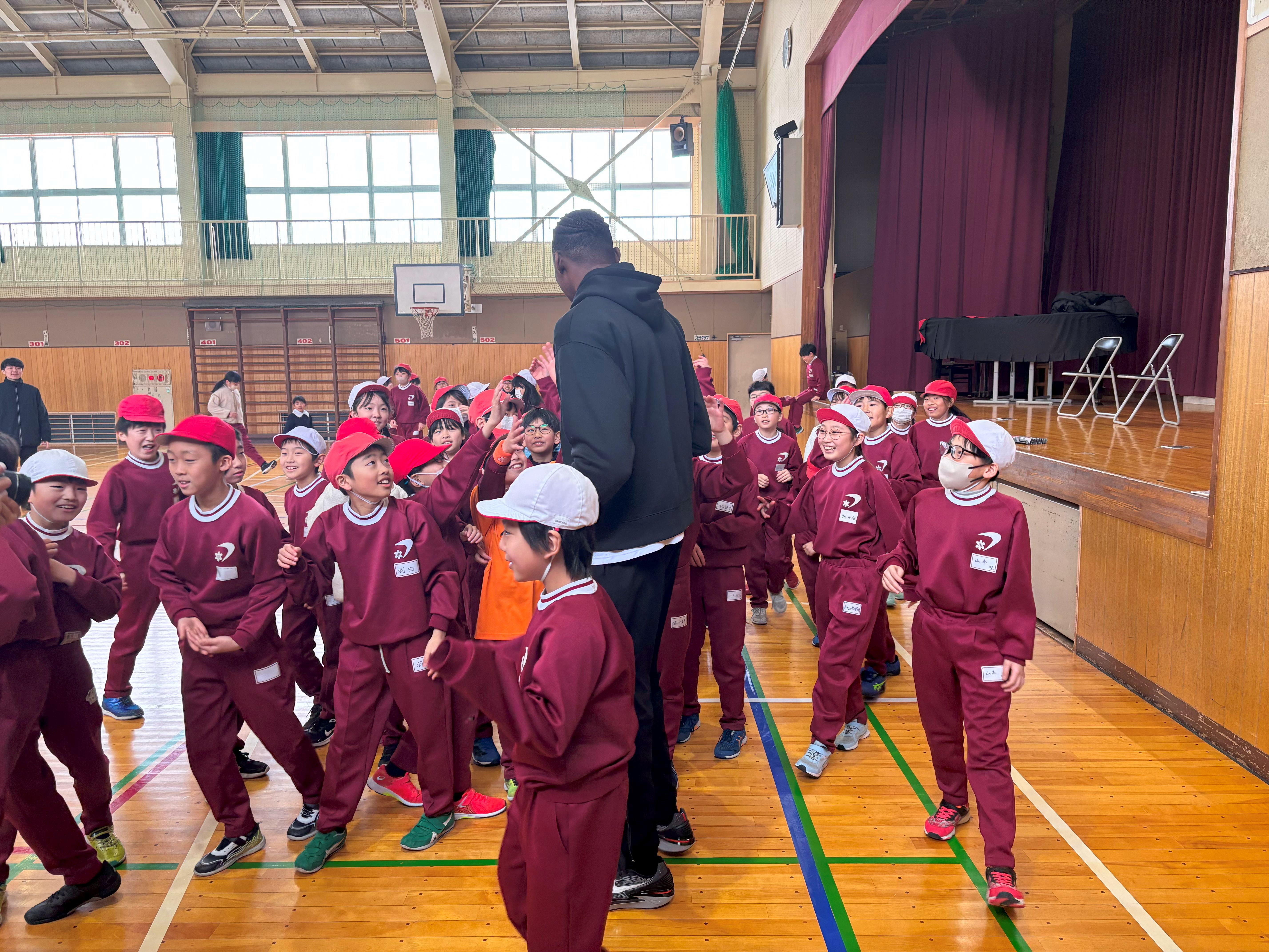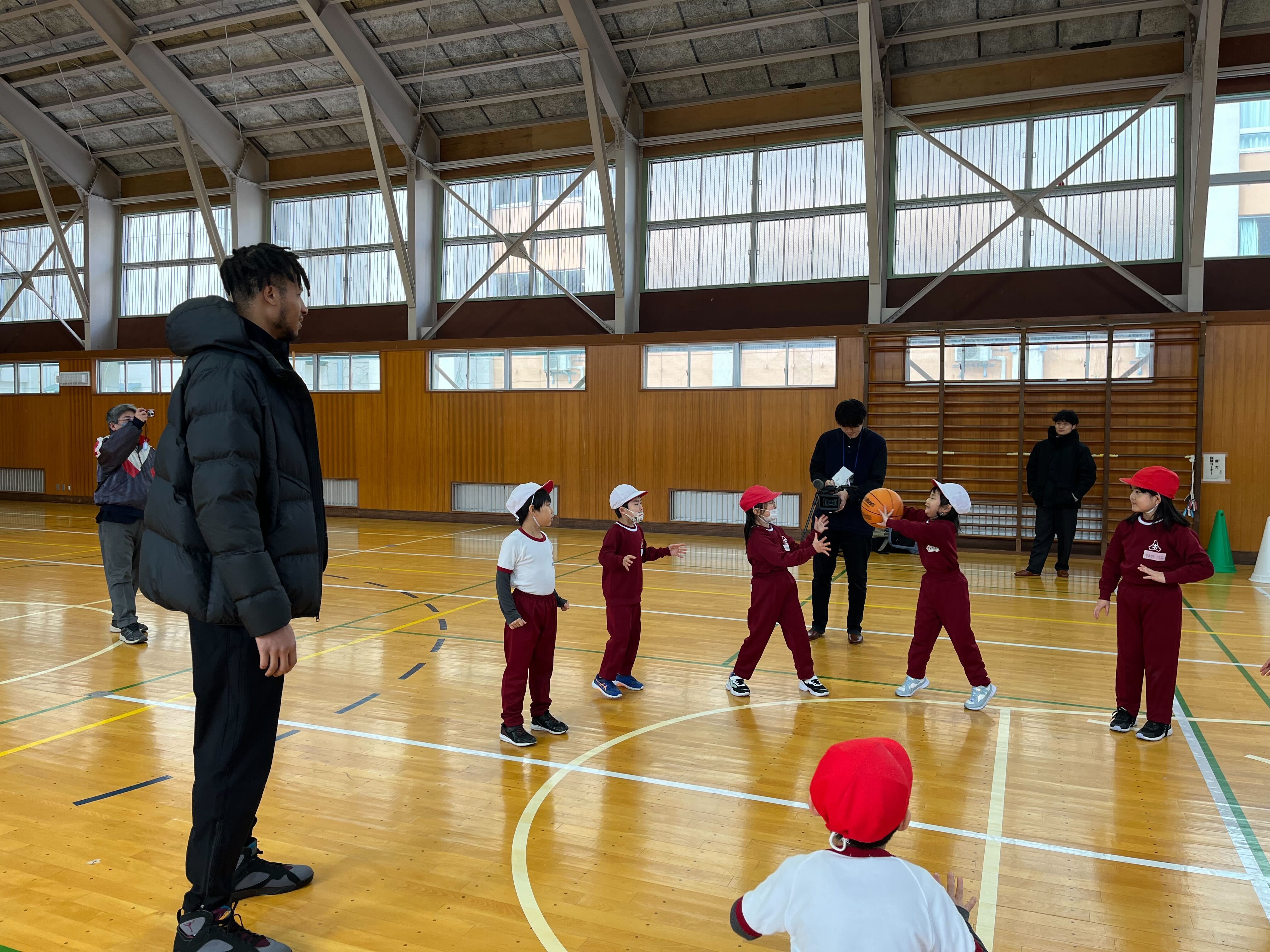 当日は、選手たちが授業の時間に合わせて各校を訪れ、バスケットボールを直接寄贈。子どもたちは、受け取ったボールを使ってバスケットボールに挑戦したり、選手との交流を通じて、笑顔あふれるひとときを過ごしました。