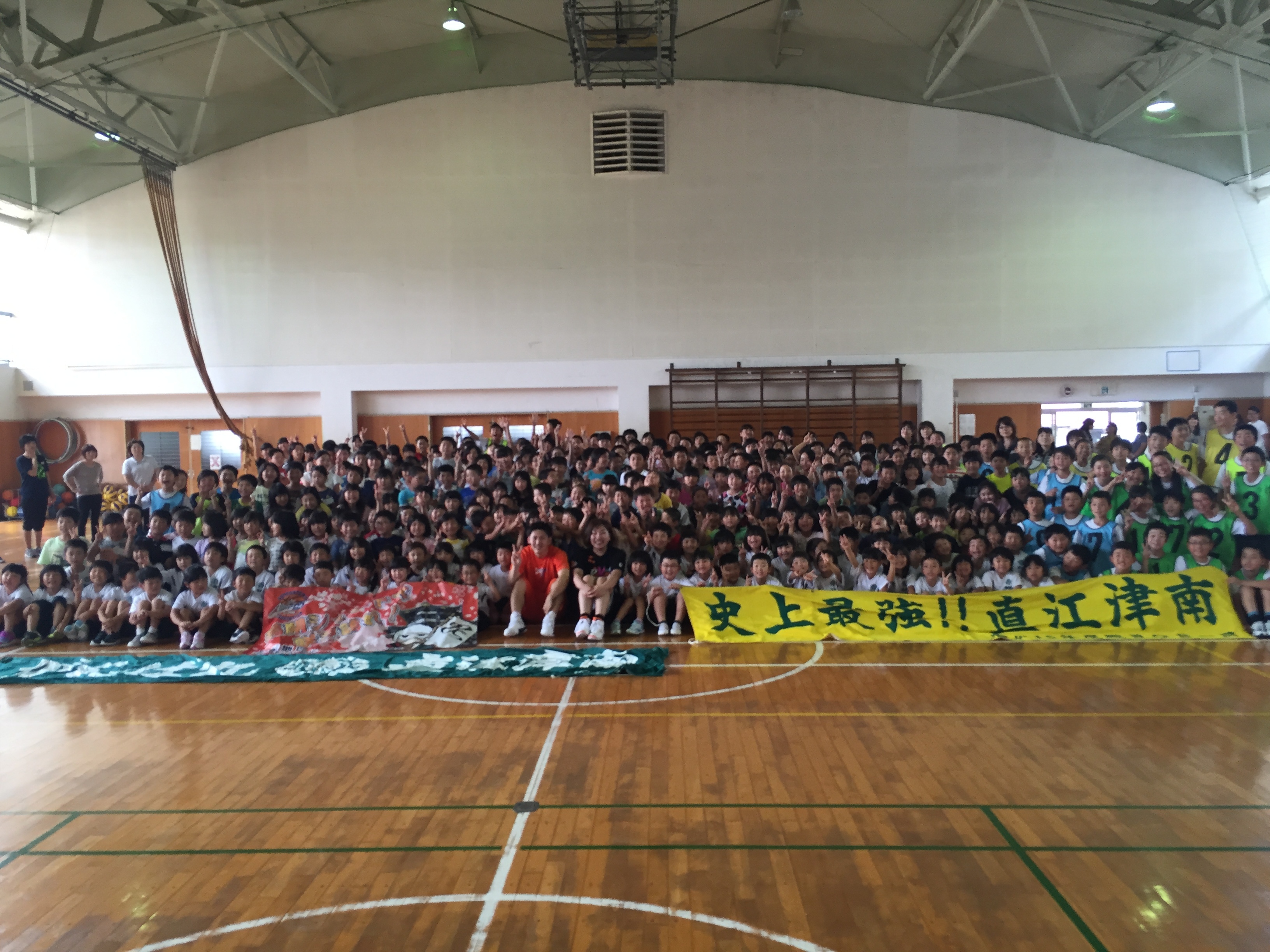 直江津小学校交流会:ミニゲームで交流。その後、子どもたちから選手に質問タイムを実施。