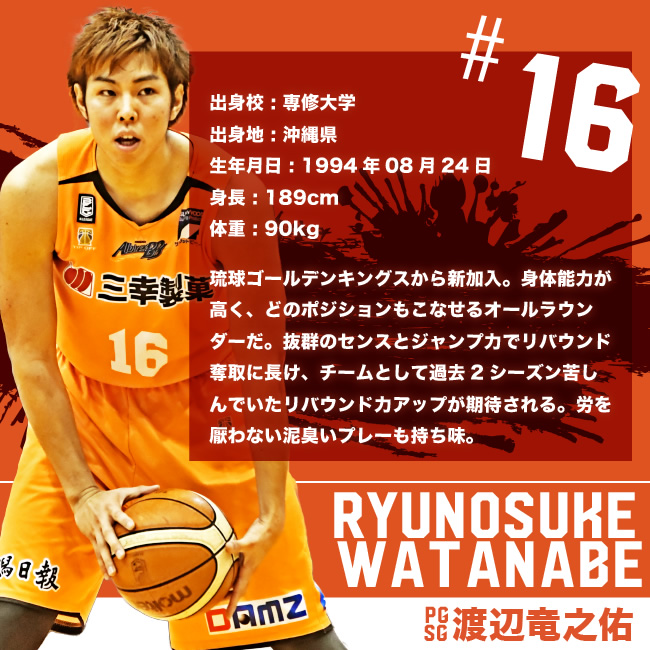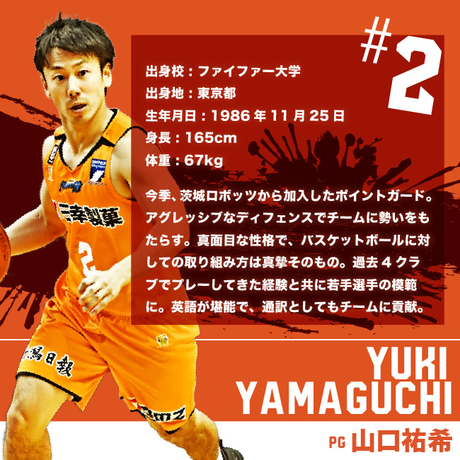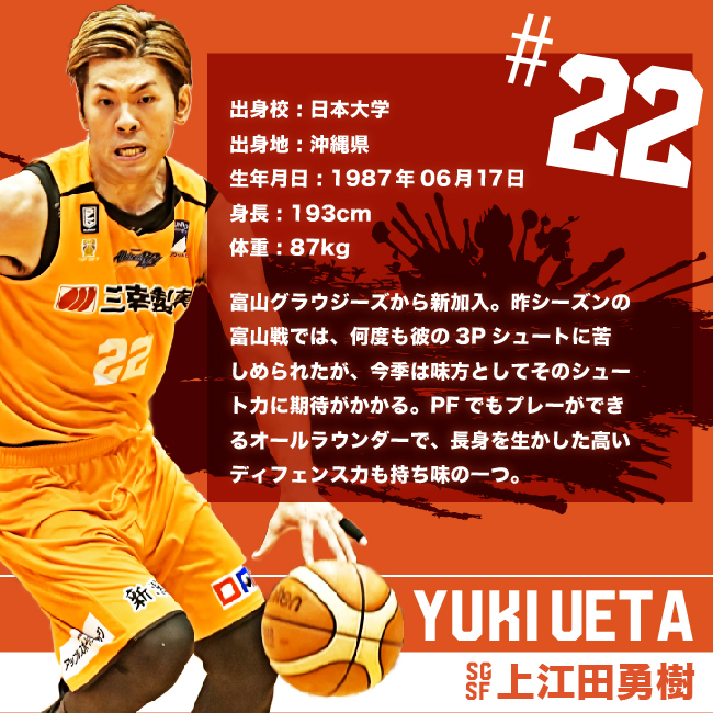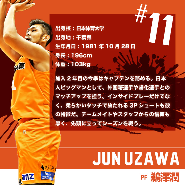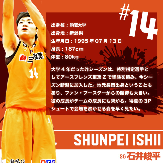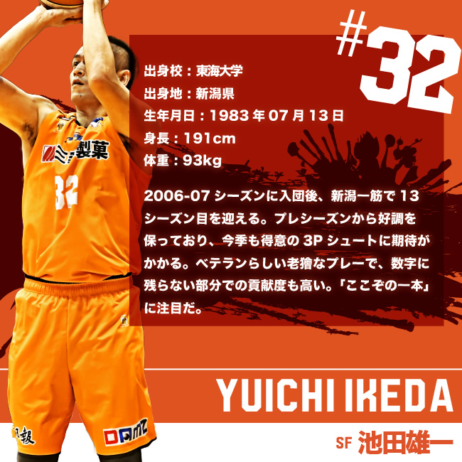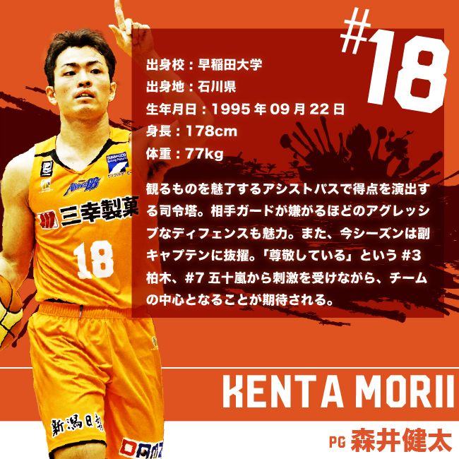 地元新潟県出身でチームの顔。リーグ屈指のスピードを生かしたドライブ、味方の得点を演出する華麗なパス、そして勝負所での3Pシュートが武器。特に”ゾーン”に入った時の連続3Pシュートは鳥肌もの。38歳とは思えない外見もさることながら、年齢を感じさせないキレのあるプレーでチームを勝利へ導く。今季もその活躍にご期待ください!