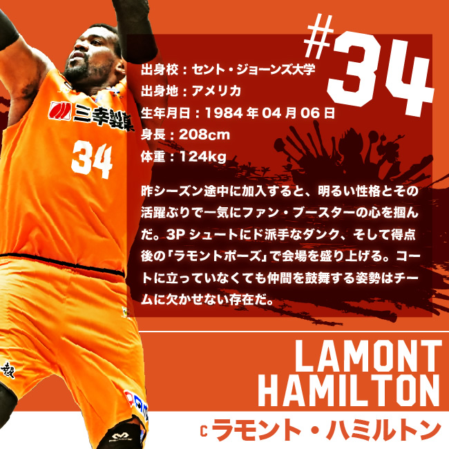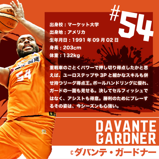 昨シーズン得点王に輝いた「リーグNo.1スコアラー」。203cm、132kgという体格を生かし、2、3人に囲まれても動じないパワフルなゴール下でのプレー、それとは反対に軽やかなステップからの得点や3Pといった器用さも併せ持つ。1試合47得点というB1最多得点記録も保持するなど、今季も得点量産が期待される。その凄さを是非アリーナで!