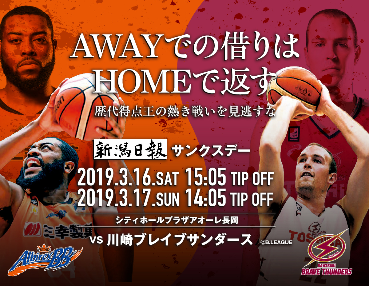 川崎といえば、先日行われたワールドカップアジア2次予選でも日本代表として活躍した#7/PG 篠山竜青、#14/SG 辻直人、#22/C ニック・ファジーカスの3人がチームを牽引する強豪クラブ。今季初対戦となった1月のアウェイゲームでは、Bリーグ初代得点王でもあるファジーカスに27得点、辻直人には得意の3Pを含む19得点を許すなど、連勝を止められてしまった。川崎に対しては、過去2シーズンで僅か1勝と苦しんでいるが、新潟は上江田が2月の北海道戦で復帰、さらに新たにアマンゼ・エゲケゼが加入し、チーム層も厚くなるなど好材料が揃う。「アウェイでの借りは、ホームで返す!」ホーム・アオーレ長岡で首位の力強さを見せつけ、連勝を掴みたい。