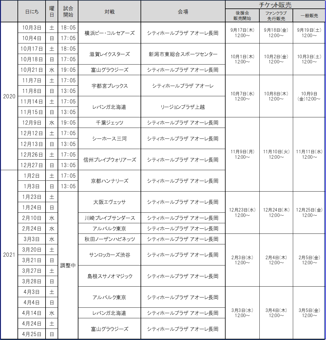 新潟アルビレックスBBでは、B.LEAGUE 2020-21シーズンのチケット販売スケジュールが決まりましたのでお知らせいたします。