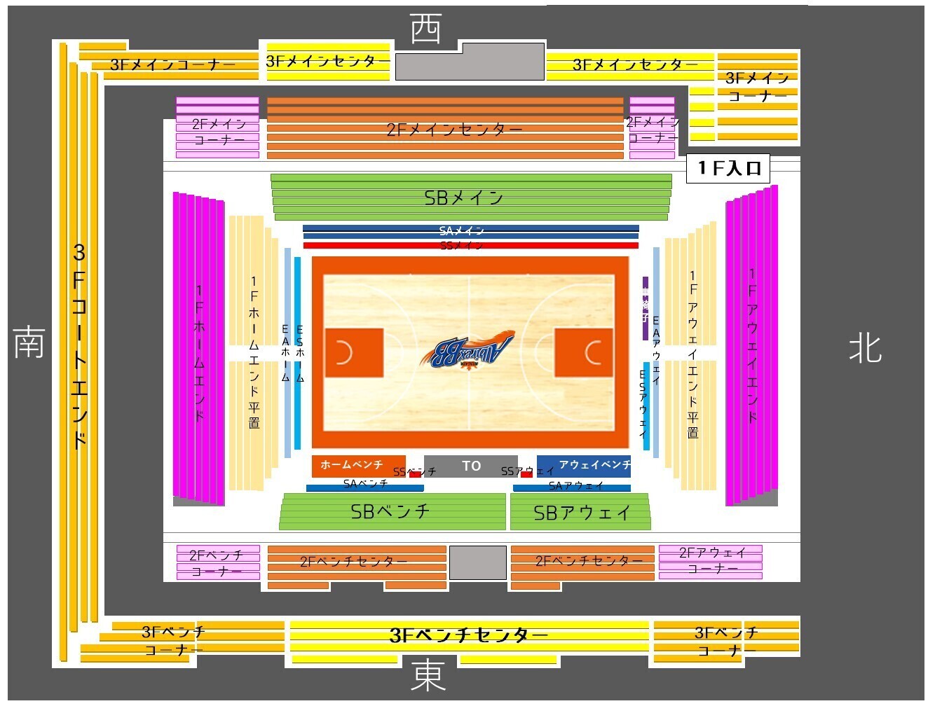 後援会特典ワンコインチケットの対象エリアは1Fホーム/アウェイエンド平置・3Fコーナー/コートエンドとなります。