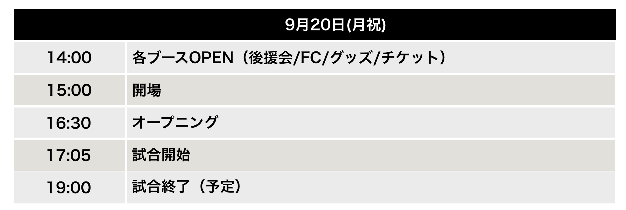 | 日時 | 9月20日(月祝) 一般開場 15:00 試合開始17:05 |