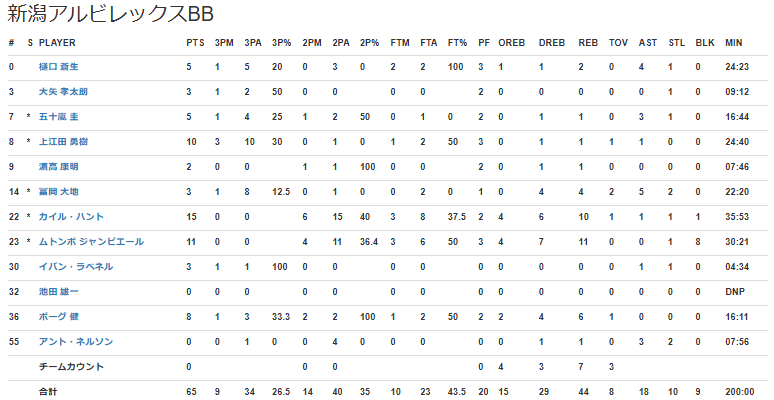 新潟アルビレックスBB 65-55 徳島ガンバロウズ
