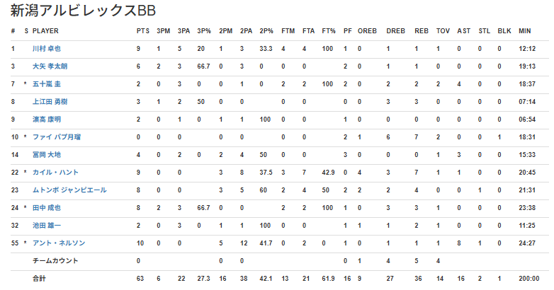 新潟アルビレックスBB 63-87 香川ファイブアローズ