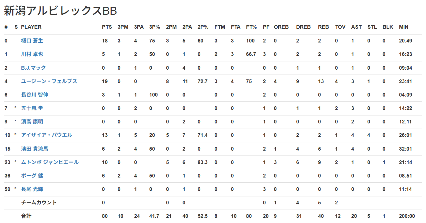 新潟アルビレックスBB 80-56 山口パッツファイブ
