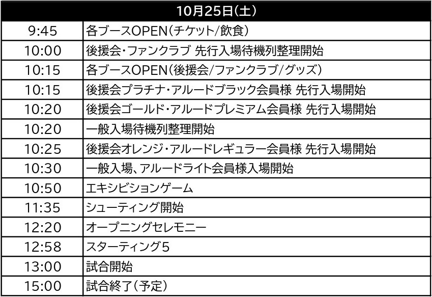 ・後援会会員様・アルードクラブ会員様の入場待機列は、開場の15分前からお並びいただくことが可能です。その他の一般の方は開場の10分前から待機列整理をおこないます。
