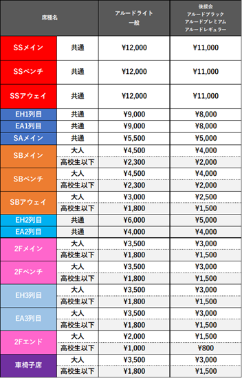 ・「アルードライト・一般」、「後援会・アルードブラック/プレミアム/レギュラー」と2つの料金形態で、それぞれ固定価格で販売いたします。・今節は全席指定席となります。
