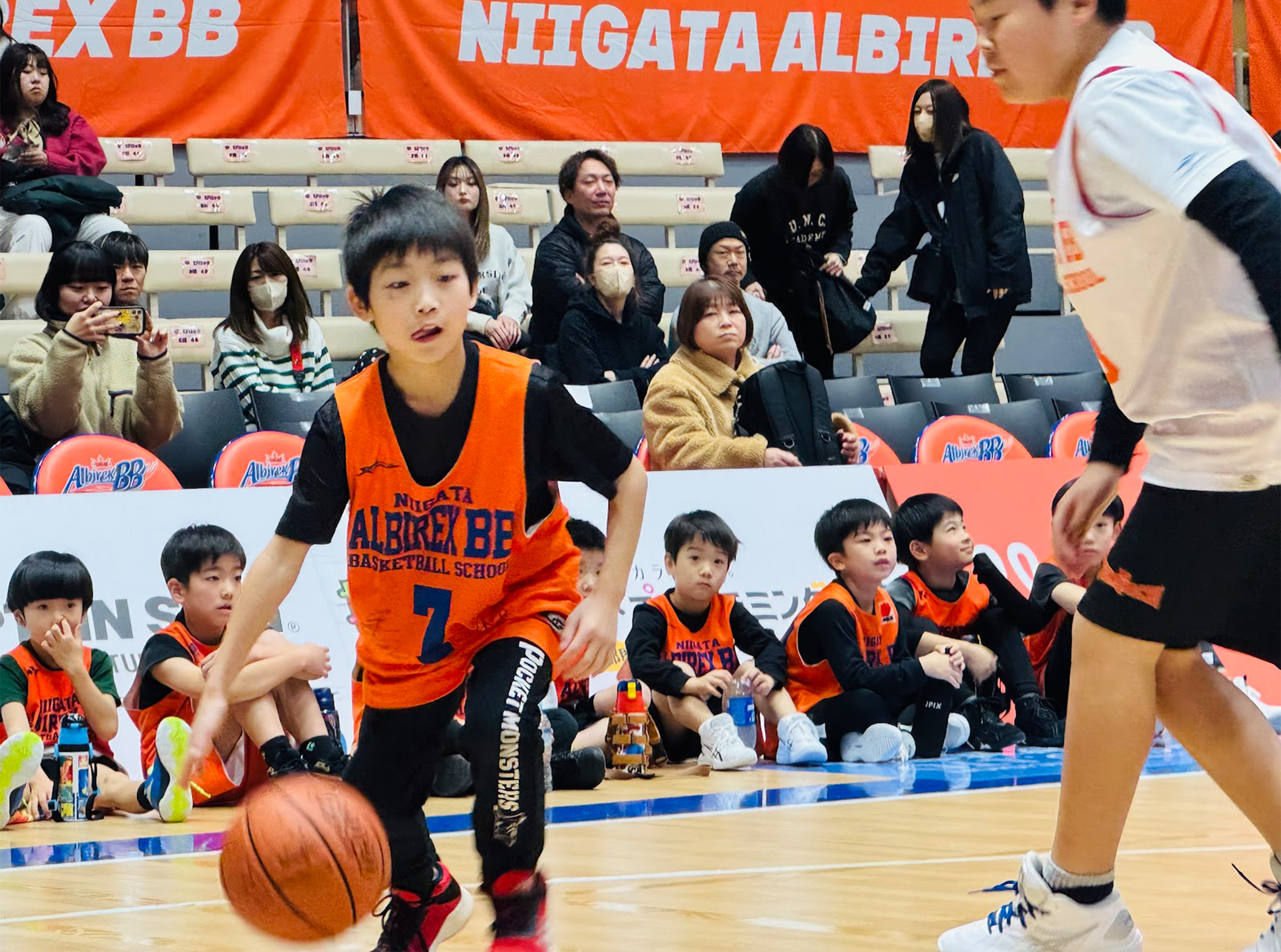 年中園児~小学6年生までの新潟アルビレックスBBスクールのスクール生が憧れの選手と同じコートに立ち紅白戦を実施。日頃の練習の成果を発揮します!