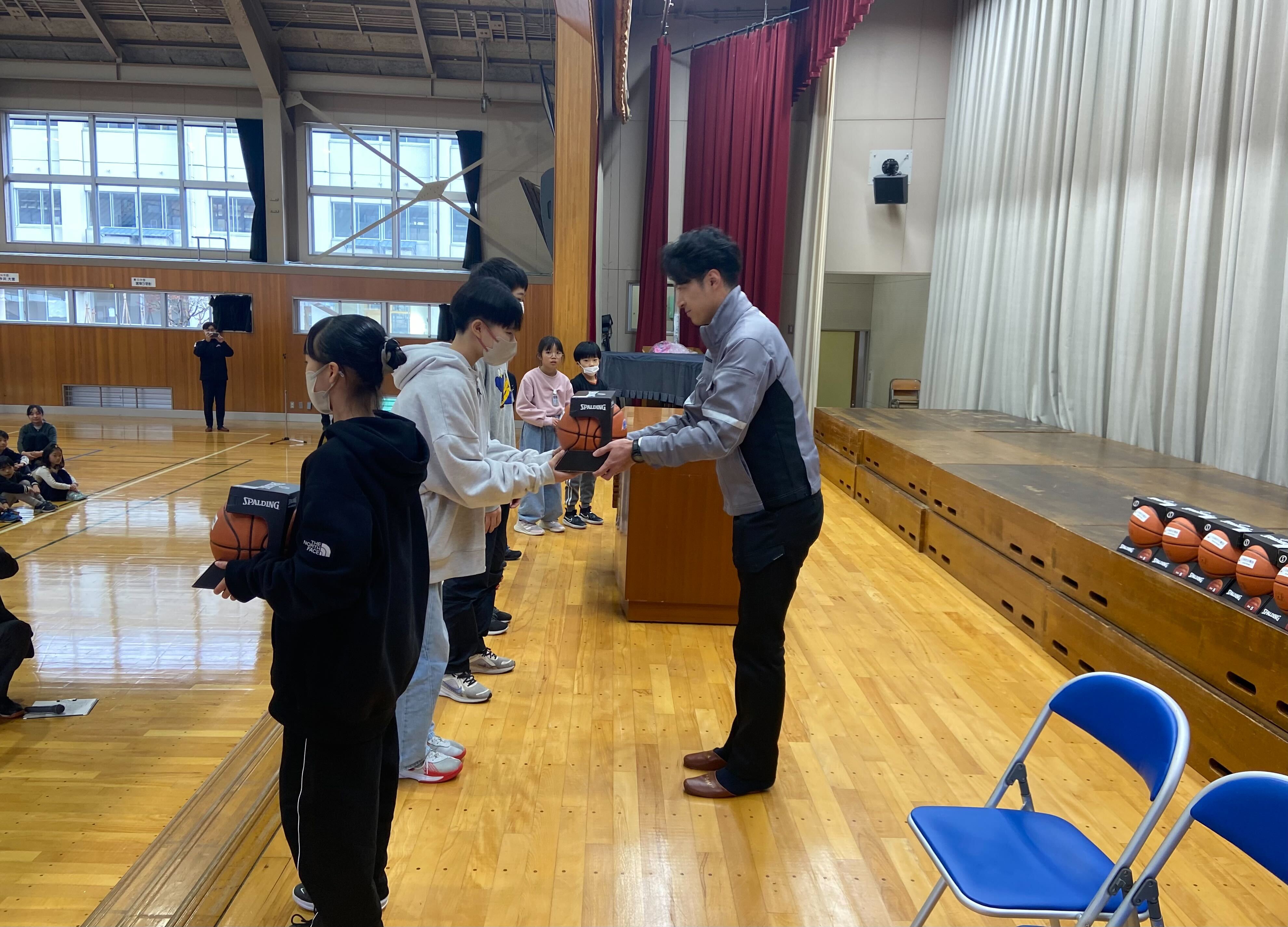 新潟アルビレックスBBでは、これまでたくさんの小・中学校に訪問し、バスケットボール教室を開催してきました。その活動の中で目にしたのは、バスケットボールがなかったり、あったとしても長年の使用で消耗してしまっているという現状でした。バスケットボール界の未来を背負っていく子どもたちに、競技を楽しく身近に感じてもらいたいという想いから、石崎防災電設様のご協賛のもと、バスケットボールをプレゼントしました。