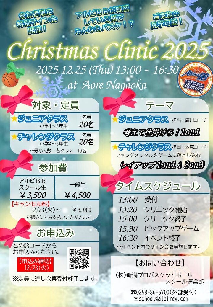 新潟アルビレックスBBスクールでは、12月25日(木) アオーレ長岡にて「Christmas Clinic 2025」を開催いたします。